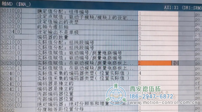 对于这台机床,我们可以看到,第一个测量系统是主动编码器,30230的第0位是第一测量系统,值为2,即驱动器中的X421接口,X421界面连接到网格尺。但点阵尺是主动编码器,电机编码器是从动编码器!这样您就知道主动(驱动)编码器中是否存在硬件故障!